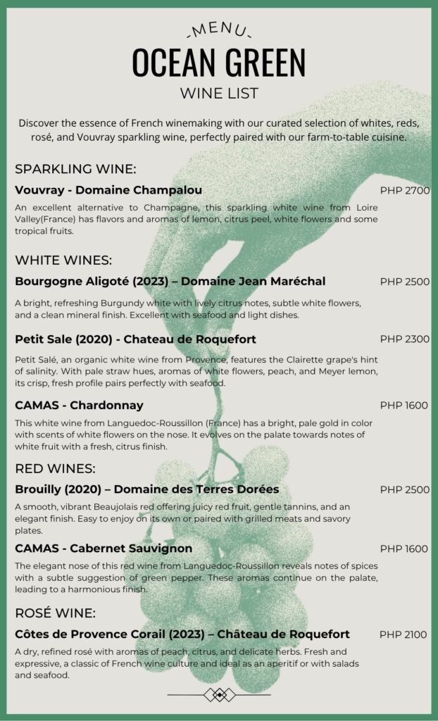 Pair your meals with the essence of French winemaking! Ocean Green Restaurant now offers a carefully curated selection of exquisite French wines, perfectly chosen to complement our farm-to-table cuisine and enhance your dining experience.