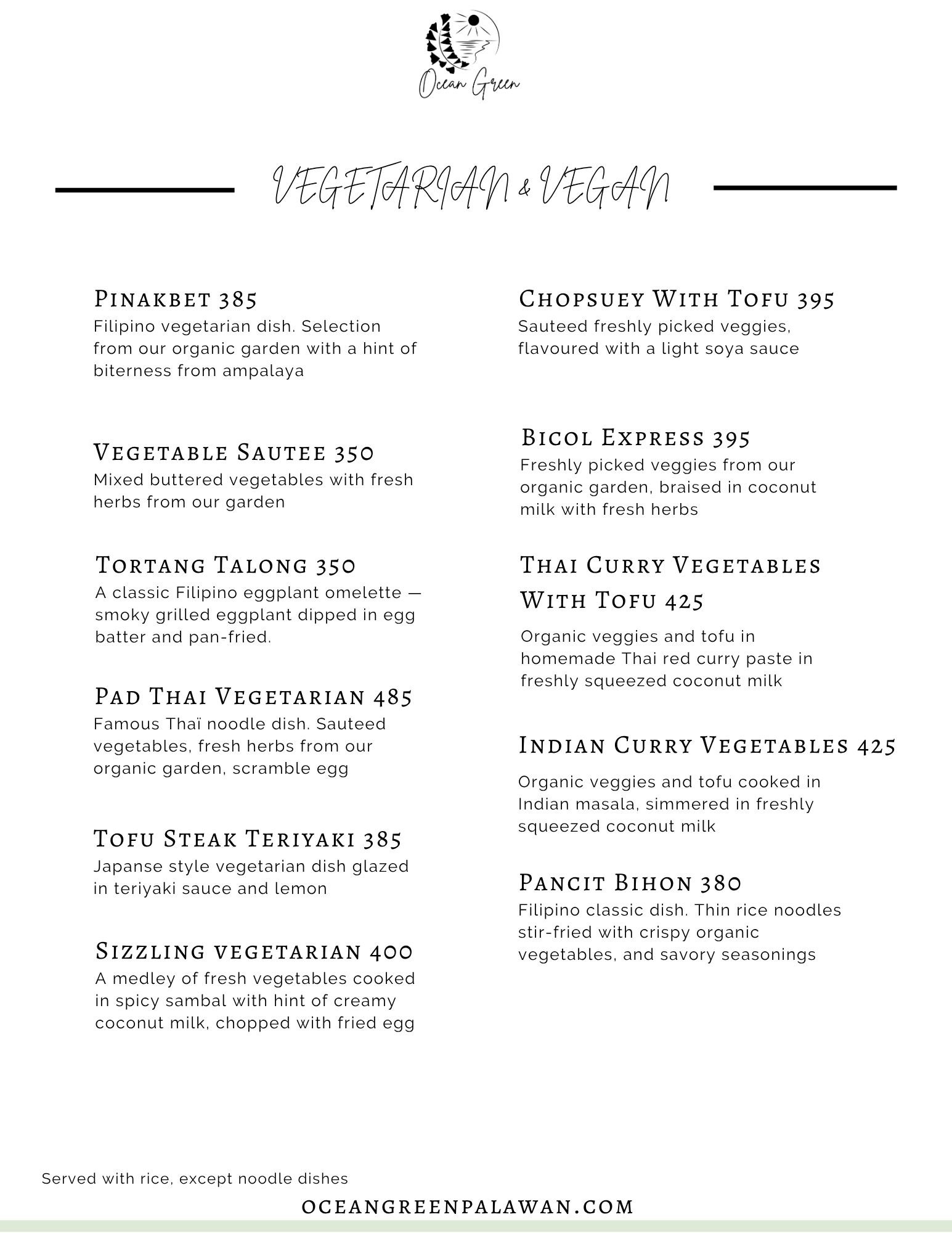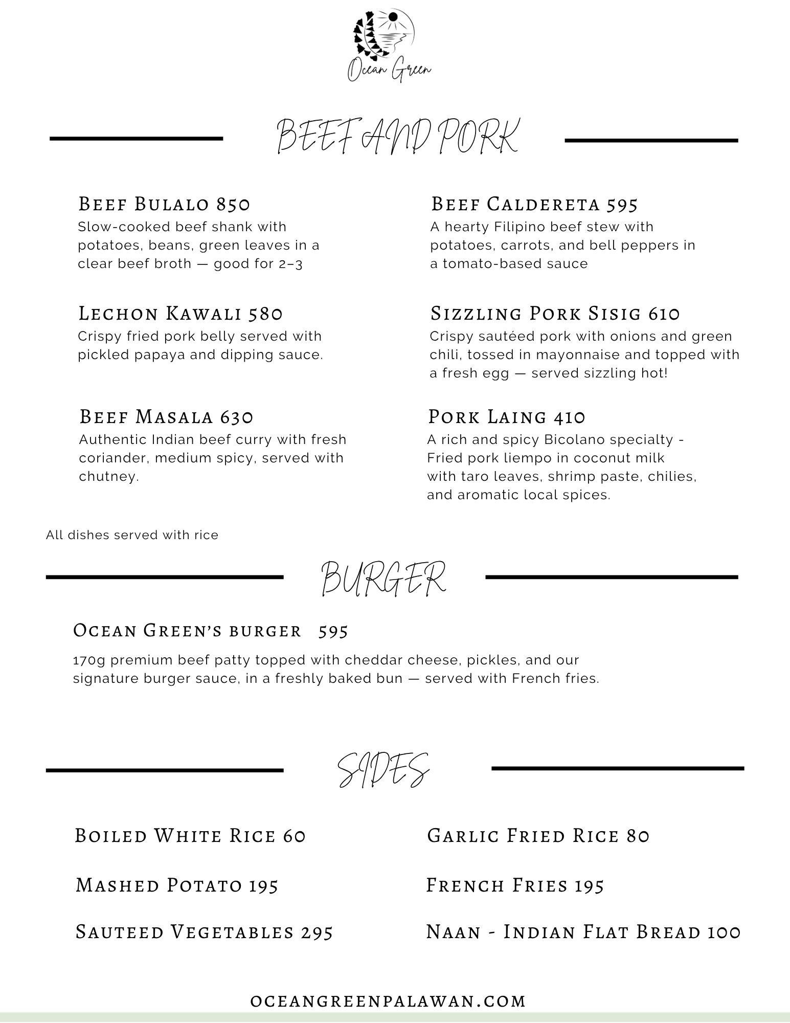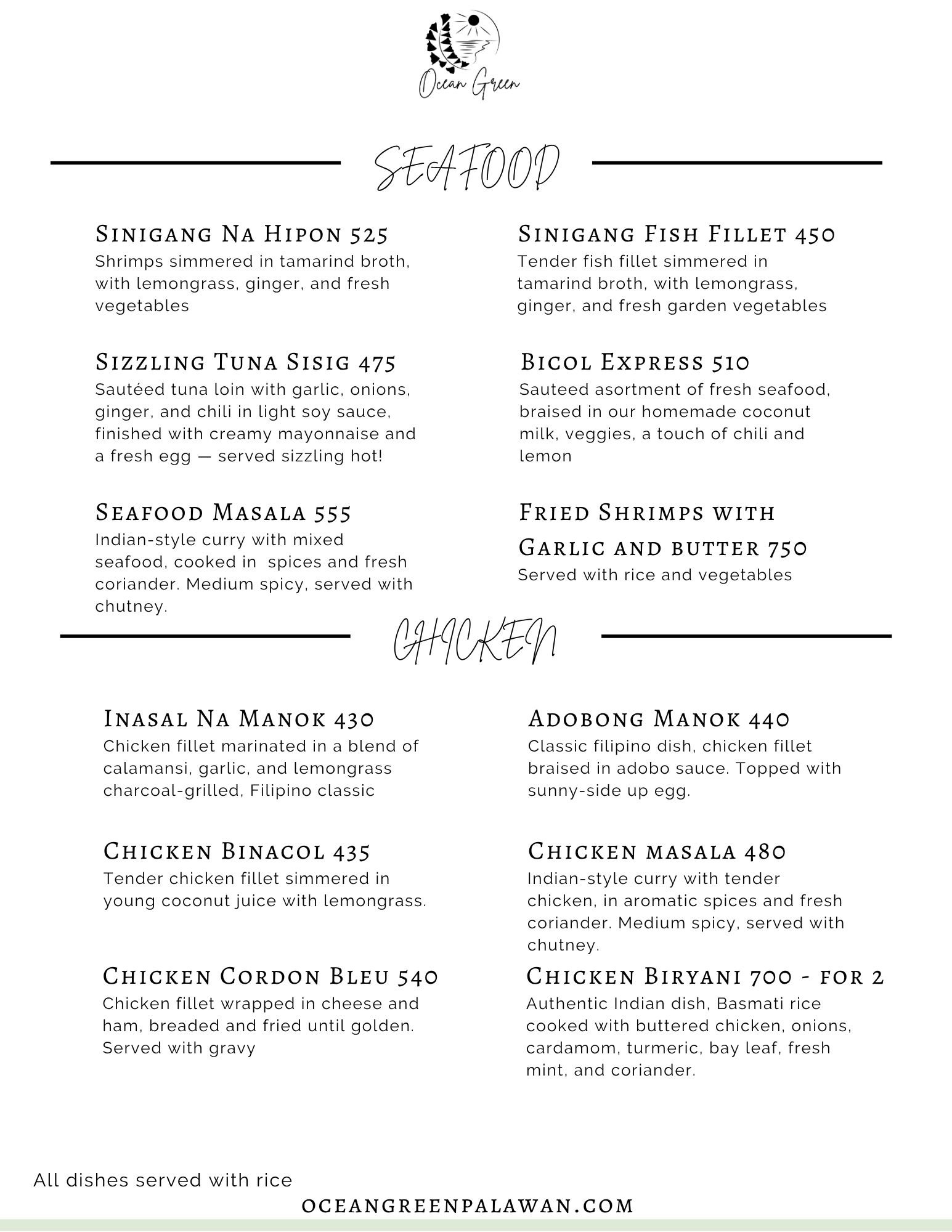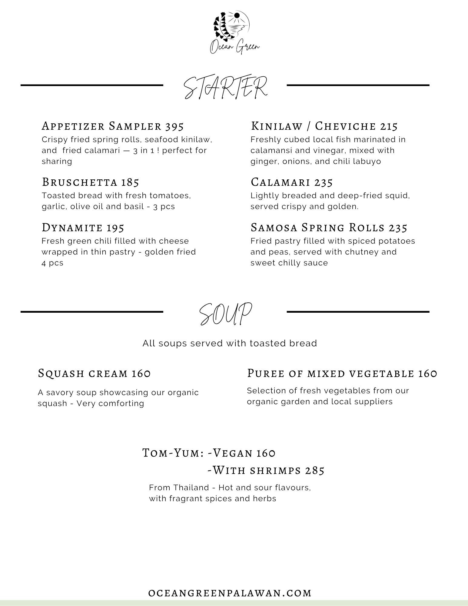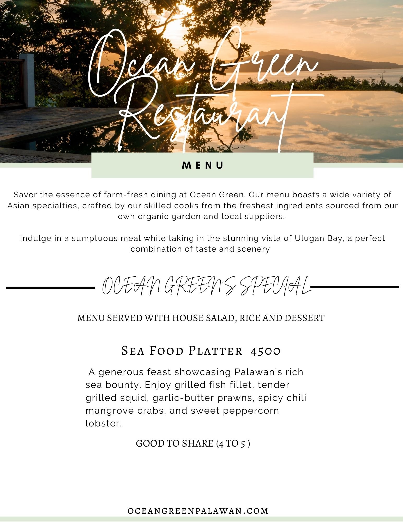 Experience the culinary artistry of Ocean Green Restaurant, guided by Jonalyn as the head of our kitchen team. Together with our talented cooks, we offer farm-to-table dining with breathtaking views of Ulugan Bay near the renowned Underground River. Each dish is crafted with care, using the freshest organic ingredients from our garden and seafood sourced directly from local fishermen.